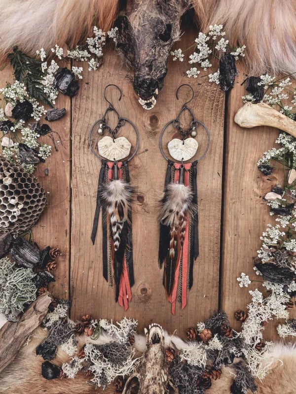 A statement of ancestral power and raw beauty. These earrings fuse deep black and fiery red leather with striking bone elements, charms, and feathers. Each pair evokes the sacred duality of earth and fire — rooted in tradition, ignited by spirit. Fierce, symbolic, and untamed, they are made for those who wear their strength with pride.