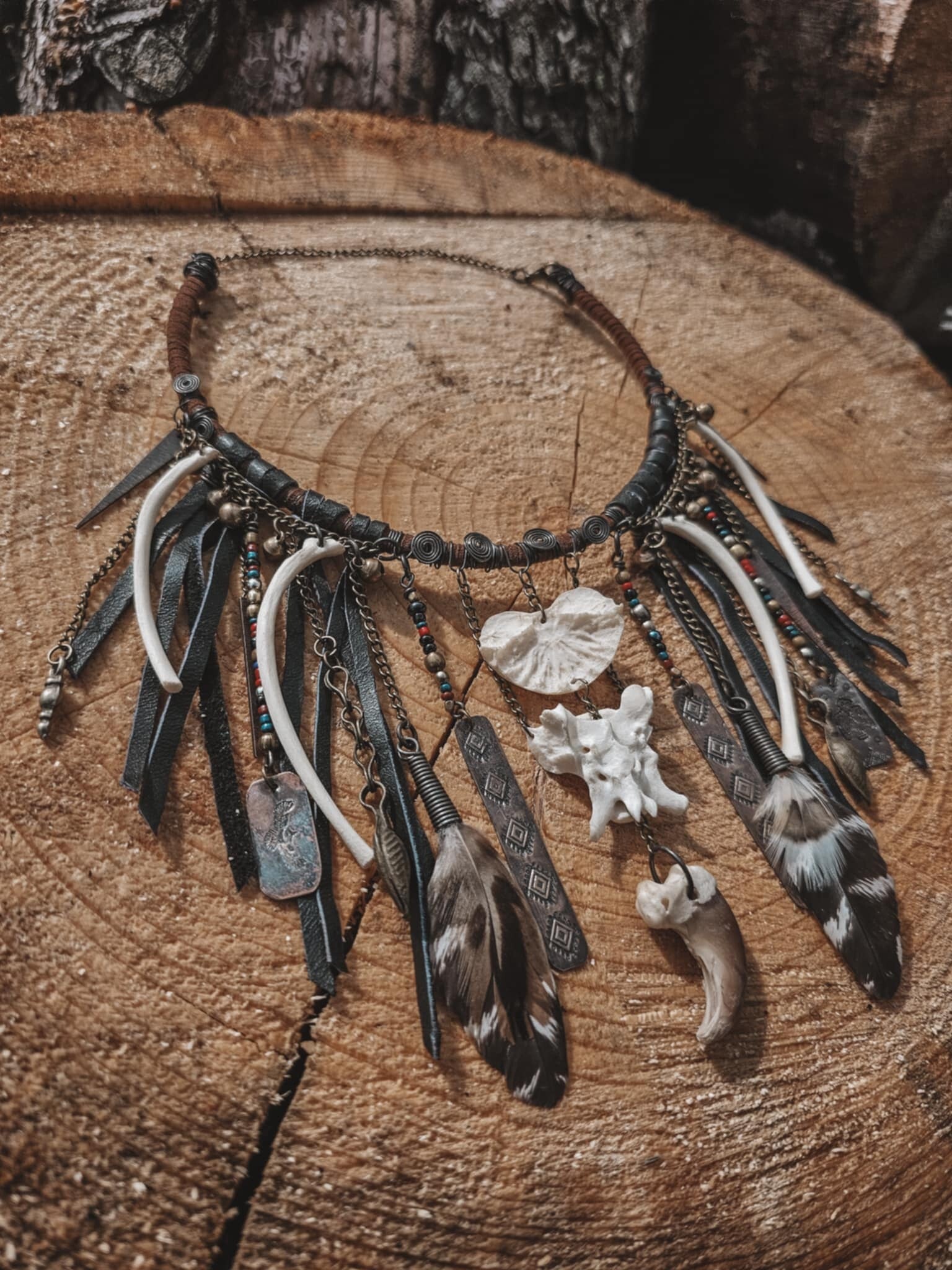 Bearmark Totem is a statement piece born from the wild. Featuring real animal bones and an ethically sourced bear paw, this necklace channels primal energy, strength, and resilience. Every detail tells a story of the forest—untamed, sacred, and raw. Handmade by WildKabone, for those who walk between worlds.